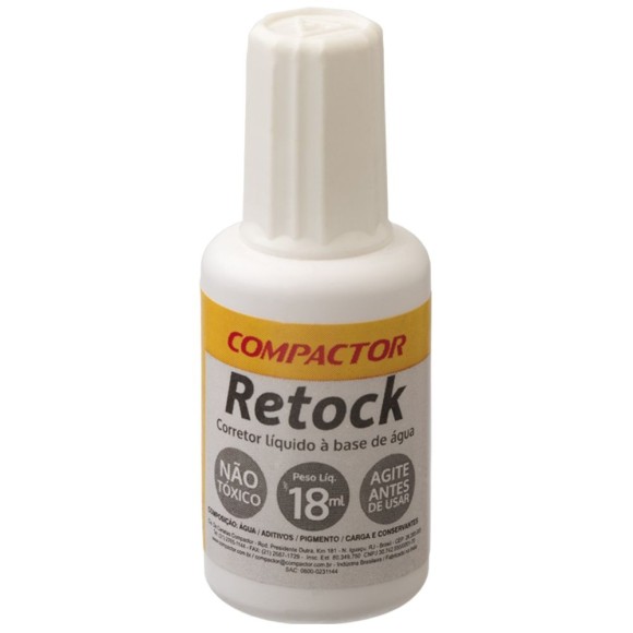 O Corretivo Líquido 18ml Retock da Compactor é perfeito para correções rápidas e eficientes no dia a dia escolar ou no ambiente de trabalho. Ideal para cobrir textos escritos com caneta esferográfica, impressões e fotocópias, ele possui fórmula à base de água, é totalmente atóxico e não resseca com facilidade. Conta ainda com tampa protetora, que garante maior durabilidade do produto.