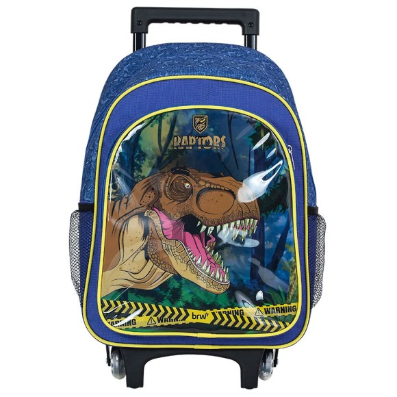 A Mochila com Rodinhas Raptor Azul e Amarelo da BRW possui rodas com silicone, visor externo para nome da criança e alça do carrinho com trava.