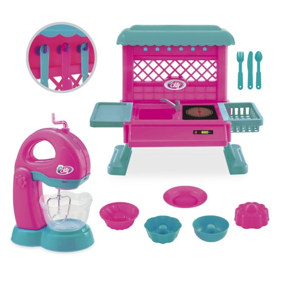 • Contém: 1 Batedeira, 1 Bowl, 1 Bancada, 1 Prato, 4 Formas e 3 Talheres