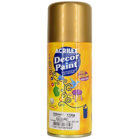 A Tinta Spray Decor Paint Ouro da Acrilex é indicada para pintura decorativa em madeira, jornal, papel, cerâmica, MDF, isopor, gesso e cortiça.