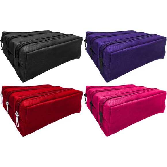 Seu design básico e funcional combina com qualquer estilo, e o fechamento em zíper oferece segurança para seus itens. Disponível em uma variedade de cores – preto, rosa, roxo e vermelho – o estojo se adapta perfeitamente às preferências de cada pessoa, seja para uso escolar ou profissional.