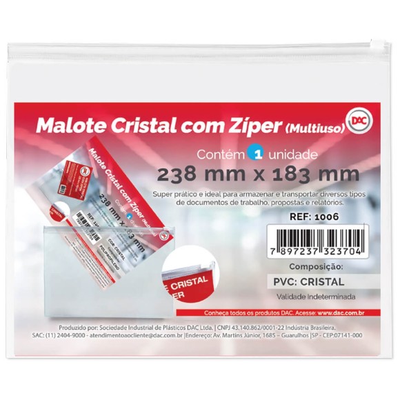 O Malote Cristal com Zíper Médio da DAC é um item muito versátil para usar na escola, em casa ou no dia a dia. Ideal para organizar, guardar ou transportar objetos, documentos, materiais escolares entre outros. Produzido em PVC Cristal tranparente é resistente à água, fechamento em zíper slide branco, prático e fácil de levar para qualquer lugar, principalmente itens de higiene, roupinhas infantis, materiais escolares entre outros.