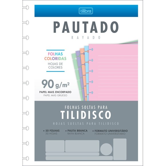 O Refil para Tilidisco Universitário Folhas Coloridas Pauta Branca 50 Folhas tem gramatura de 90 g/m² para facilitar o encaixe dos discos e oferecer mais possibilidades de escrita com diversos tipos de canetas. O produto possui furação para 11 discos.