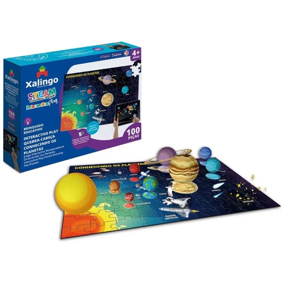 O Quebra-Cabeça - Conhecendo os Planetas da Xalingo traz para o mercado em primeira mão, a linha de jogos Interactive Play, unindo em um mesmo produto a brincadeira física e a realidade aumentada, proporcionando para a criança uma experiência ampliada de aprendizado. Depois de montar o quebra-cabeça de 100 peças em madeira, a criança poderá captar as imagens através do App e aprender sobre planetas, com muita diversão! O jogo desenvolve a atenção, a discriminação visual, o pensamento lógico e a relação parte e todo. Ideal para crianças a partir dos 4 anos. Garanta já e dê um presente divertido e educativo para os pequenos!